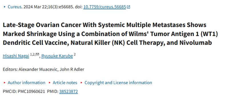治疗中,患者同步进行免疫治疗:从第18天起每两周注射 WT1-DC疫苗和纳武利尤单抗,通过红斑反应评估显示免疫激活良好。但因第 37 天腹水仍明显且 NK 细胞活性低,后续加入 NK 细胞治疗。